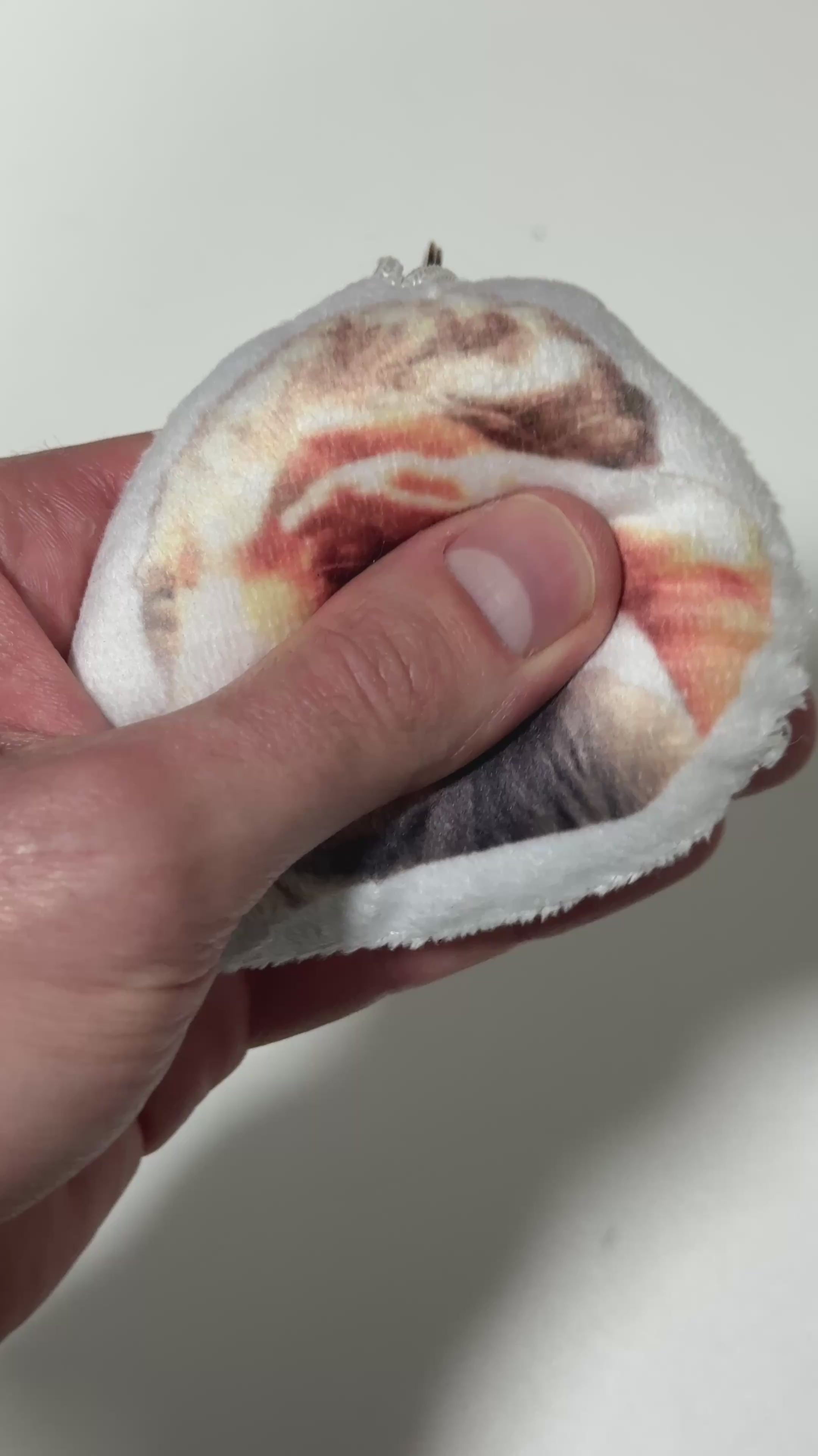 - a squishy keychain that squeaks when squeezed (squeaker, first video)